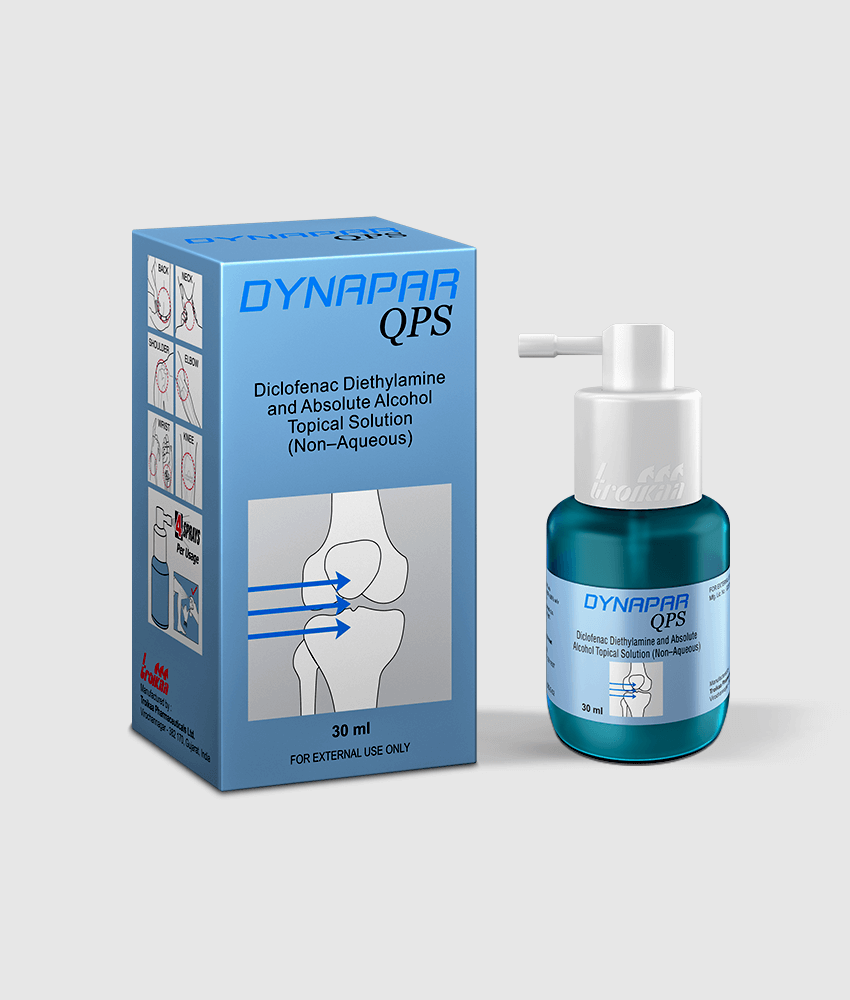 Diclofenac sodium (dynapar qps plus) topical solution is used to treat pain and swelling caused by osteoarthritis of the knees. Buy dynapar qps topical solution from kiwi. For local application on skin to relieve symptoms of pain, swelling and inflammation in muscles, joints, ligaments and tendons due to sprain, strain, fracture. Since,dynapar qps plus goes deep to the site of pain in the joints and muscles so it provides quick and effective relief from pain. Dynapar qps is available in 30 ml bottle.